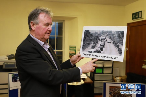 10月31日,在爱尔兰北部边境小镇克朗斯,爱尔兰新芬党议员帕特·特雷纳在办公室展示一张过去设在爱尔兰和英国北爱尔兰边境上的边防检查站的照片。新华社发