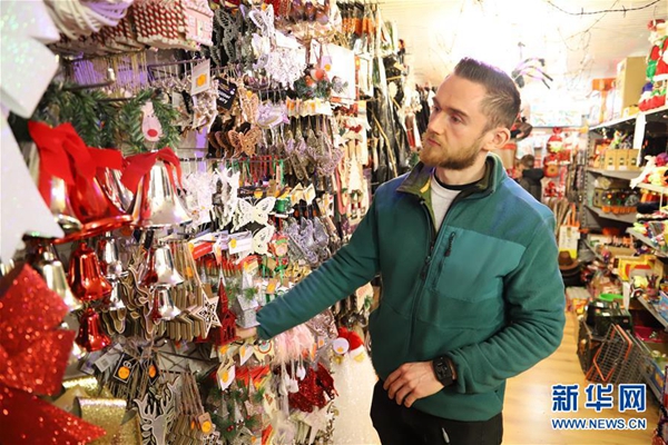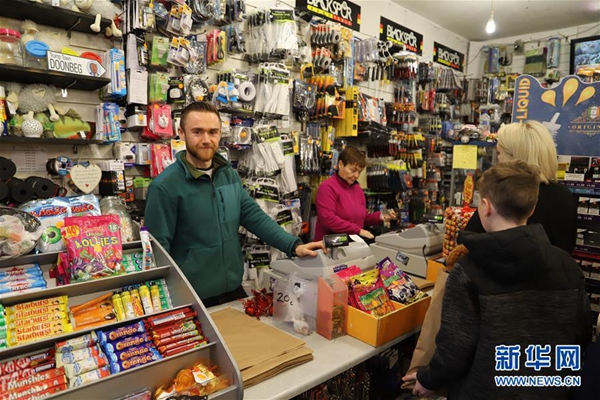 10月31日,在爱尔兰北部边境小镇克朗斯,“90后”杂货店老板夏兰·摩根在他经营的杂货店内整理刚从中国订购来的圣诞节装饰物。新华社发