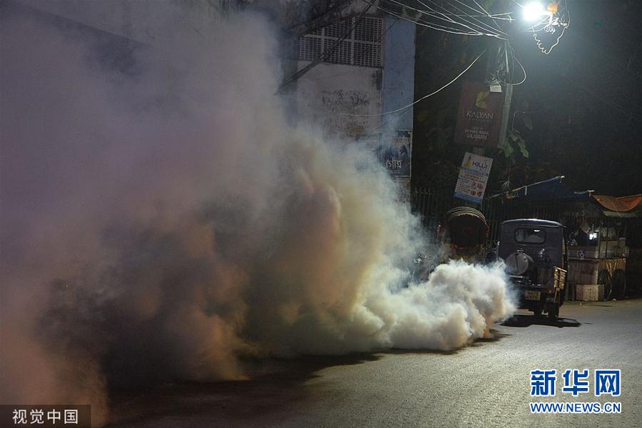 当地时间11月5日,印度西里古里,当地市政卫生工作者对一个社区进行熏蒸,以防止蚊虫滋生。(图片来源:视觉中国)