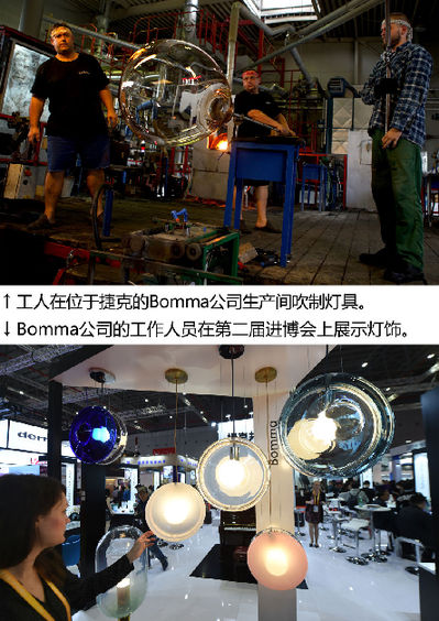 ↑这是一张拼版照片,上图为:9月16日,在捷克萨扎瓦河畔斯韦特拉,工人在水晶玻璃制造企业Bomma公司的生产间内吹制灯具(新华社发,马丁·马赫摄)。下图为:11月6日,在上海举行的第二届中国国际进口博览会上,Bomma公司的工作人员展示灯饰(新华社记者尹炣摄)。