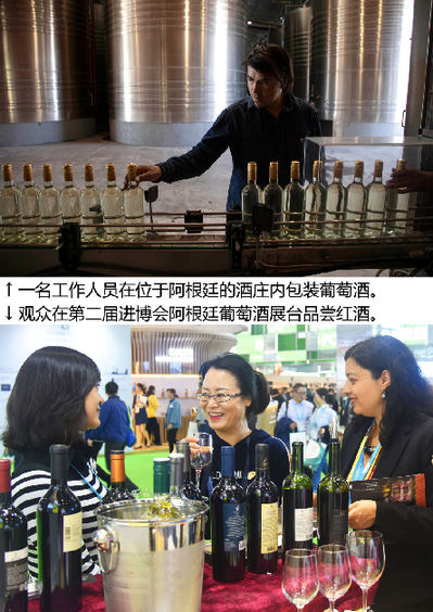↑这是一张拼版照片,上图为:9月25日,在阿根廷卡塔马尔卡省圣玛丽亚附近的一家酒庄,一名工作人员包装葡萄酒(新华社发,马丁·萨巴拉摄)。下图为:11月6日,在上海举行的第二届中国国际进口博览会上,观众在阿根廷葡萄酒展台品尝红酒(新华社记者魏海摄)。