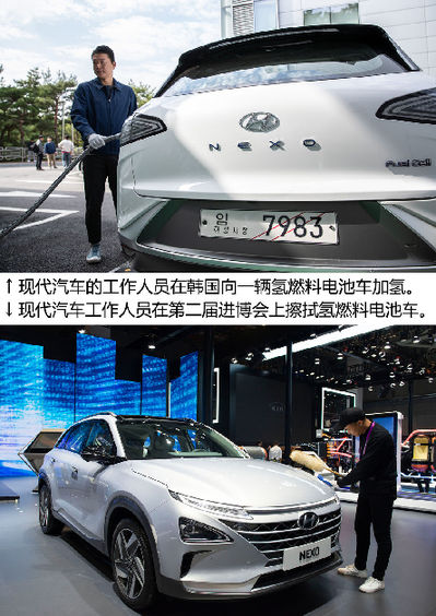 ↑这是一张拼版照片,上图为:10月22日,在韩国龙仁市,一名现代汽车的工作人员向一辆氢燃料电池车加氢(新华社记者王婧嫱摄)。下图为:11月5日,在上海举行的第二届中国国际进口博览会上,工作人员擦拭韩国现代汽车展台的氢燃料电池车(新华社记者刘昀摄)。
