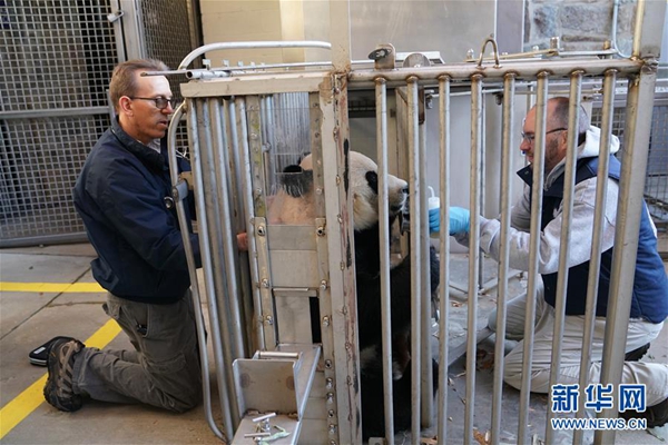11月13日,在美国华盛顿的美国国家动物园,工作人员在为大熊猫“贝贝”体检。新华社记者 刘杰 摄