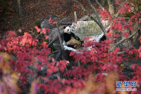 11月13日,在美国华盛顿的美国国家动物园,大熊猫“贝贝”接受体检后到室外活动。新华社记者 刘杰 摄