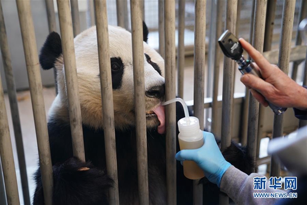 由于几个月前“贝贝”已经接受了全面体检,所以当天进行的是目视和触摸检查。记者当天在大熊猫馆里看到,“贝贝”在饲养员的引导下熟练地配合奈弗完成了一系列基本检查项目,包括测体重、听心跳等。奈弗说:“‘贝贝’的身体指标很好,我们认为它能够应对长途旅行。”