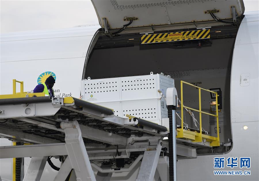 11月19日,在美国华盛顿附近的杜勒斯国际机场,装有大熊猫“贝贝”的箱子被运上飞机。 新华社记者 刘杰 摄