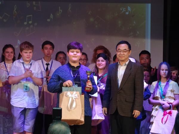 中国驻圣彼得堡代总领事张卫给中文歌曲大赛获奖参赛选手颁奖。