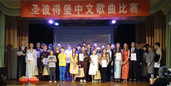 参加圣彼得堡中文歌曲大赛的选手和嘉宾合影。