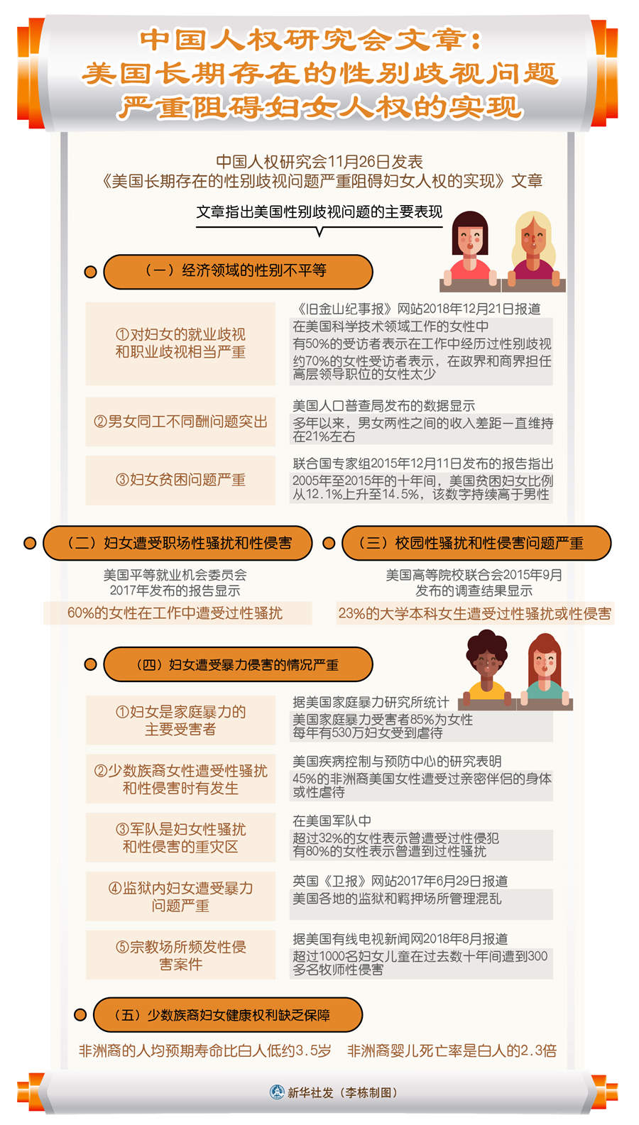 新华社北京11月26日电 中国人权研究会26日发表《美国长期存在的性别歧视问题严重阻碍妇女人权的实现》文章。全文如下: