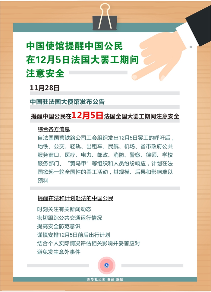 新华社巴黎11月28日电(记者刘金辉)中国驻法国大使馆28日发布公告,提醒中国公民在12月5日法国全国大罢工期间注意安全。