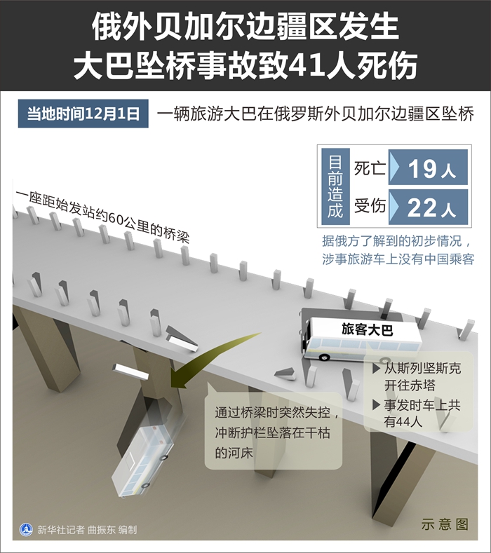 新华社莫斯科12月1日电 一辆旅游大巴1日在俄罗斯外贝加尔边疆区坠桥,目前已造成19人死亡、22人受伤。中国驻伊尔库茨克总领馆说,据俄方了解到的初步情况,涉事旅游车上没有中国乘客。