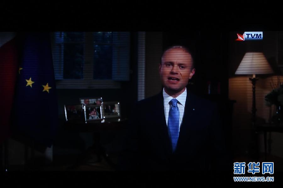 这是12月1日在马耳他瓦莱塔拍摄的马耳他总理穆斯卡特通过国家电视台发表讲话的电视画面。 新华社发(乔纳森·博格摄)