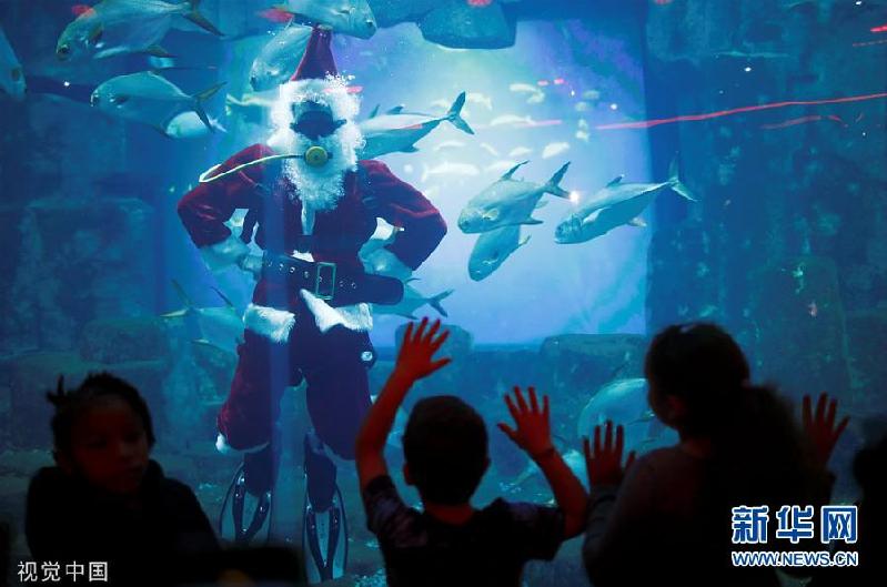 圣诞节将至 巴黎水族馆工作人员扮成“圣诞老人”水中畅游