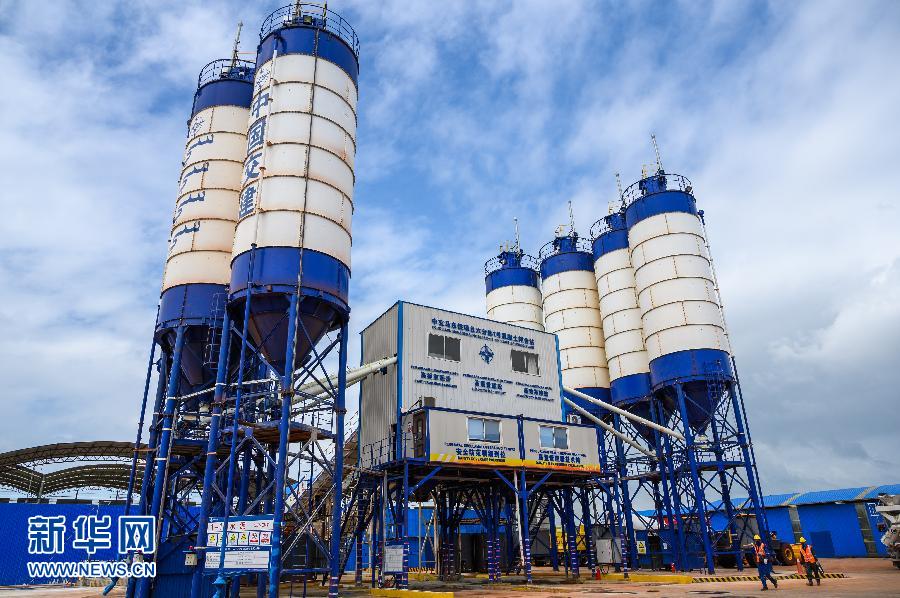 12月6日,在马来西亚关丹,两名工人在东海岸铁路项目一座混凝土拌合站内走过。新华社记者朱炜摄