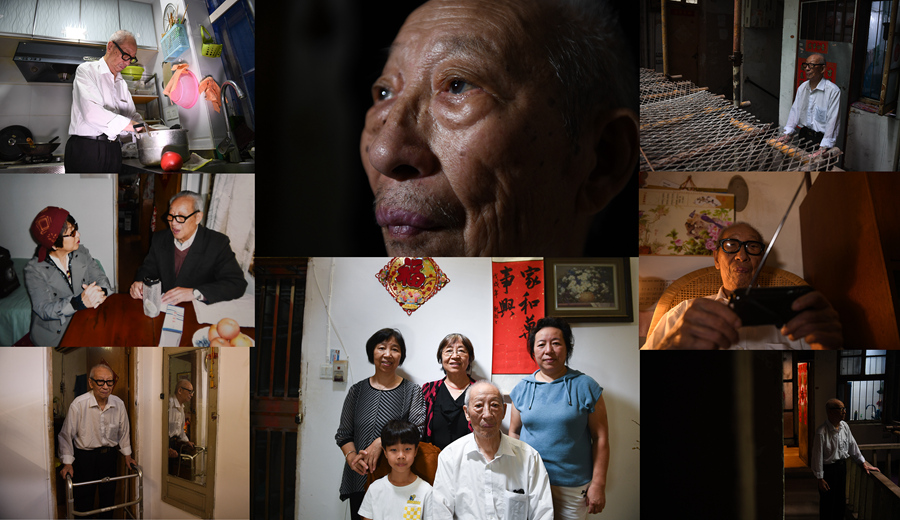 中上:余昌祥肖像;中下:余昌祥和大女儿余惠霞(后中)、二女儿余惠如(后左)、三女儿余惠明、重外孙王萌皓在家中合影;左上:余昌祥在厨房忙碌;左中:余昌祥在家中和日本友人松冈环交谈(翻拍照片);左下:腿脚不便的余昌祥在家中行走;右上:余昌祥在家门口静心;右中:余昌祥在卧室内听收音机;右下:余昌祥在家门口(拼版照片,7月12日摄)。