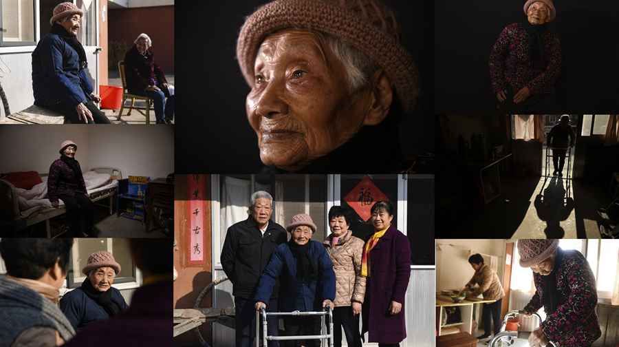 中上:巫吉英肖像;中下:巫吉英在家门口和大儿子张爱华、二女儿张月珍、小女儿张素琴(右)合影;左上:巫吉英在家门口与邻居聊天、晒太阳;左中:巫吉英在自己卧室内;左下:巫吉英在家门口和女儿聊天;右上:巫吉英在指认被侵华日军刺伤的部位;右中:巫吉英腿脚不好,只能靠助行器行走;右下:巫吉英准备走到饭桌前吃午饭(拼版照片,12月5日摄)。