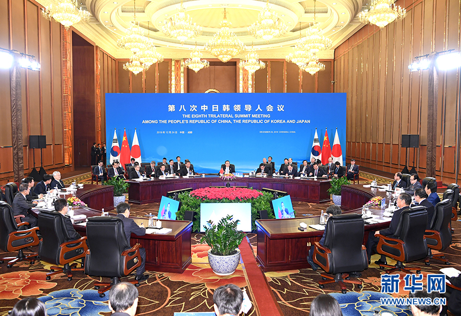 12月24日,国务院总理李克强在成都与韩国总统文在寅、日本首相安倍晋三共同出席第八次中日韩领导人会议。新华社记者 张领 摄