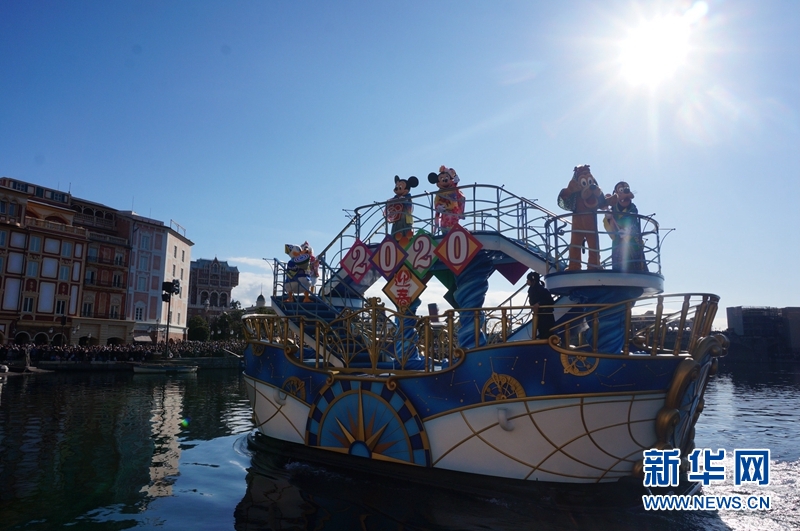 1月1日,在日本东京迪士尼海洋乐园,装扮成迪士尼卡通人物的演员在新年巡游上表演。杨汀 摄