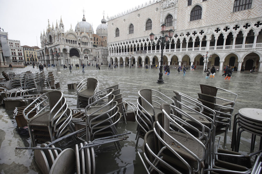 2019年11月13日,在意大利威尼斯,人们走在洪水泛滥的圣马可广场上。受极端天气影响,威尼斯遭遇严重洪灾。新华社发(阿尔贝托·林格里亚摄)