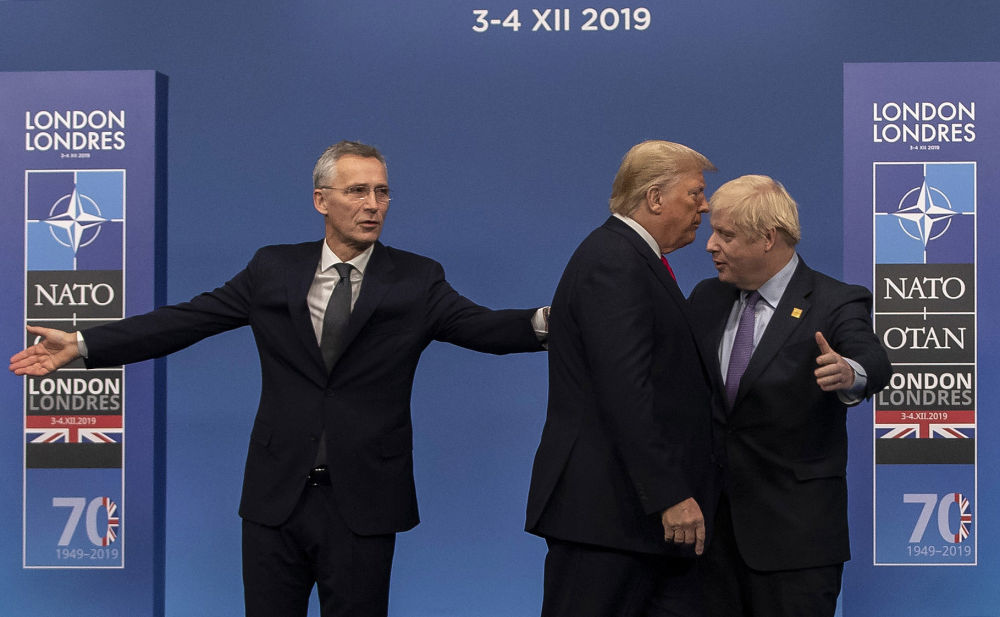2019年12月4日,在英国伦敦举行的北约峰会上,北约秘书长斯托尔滕贝格(左)、英国首相约翰逊(右)欢迎美国总统特朗普。新华社记者 韩岩 摄