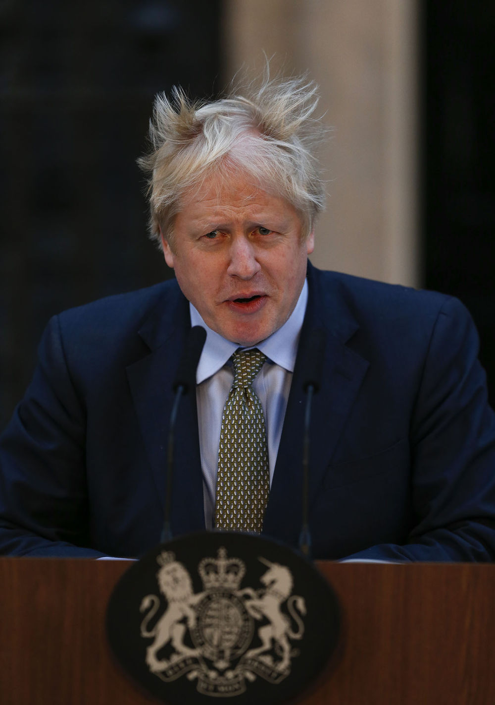 2019年12月13日,英国新任首相鲍里斯·约翰逊在伦敦的唐宁街10号首相府发表演讲。在率领保守党赢得英国议会下院选举后,约翰逊当天正式就任英国首相。新华社记者 韩岩 摄