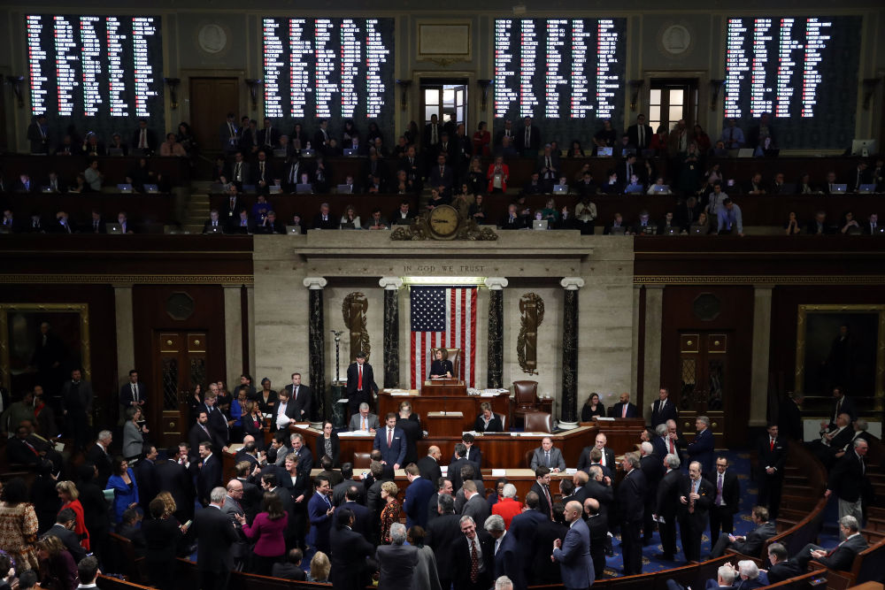 2019年12月18日,在美国首都华盛顿,美国国会众议院就针对总统特朗普的弹劾条款进行投票。当天,由民主党人掌控的国会众议院表决通过两项针对总统特朗普的弹劾条款,正式指控他滥用职权和妨碍国会。新华社发(奇普·索莫德维利亚摄)