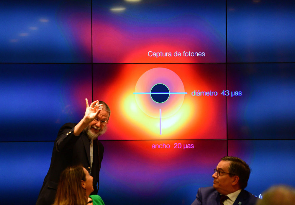 2019年4月10日,在智利圣地亚哥,“事件视界望远镜”项目召开新闻发布会。数百名科研人员参与合作的“事件视界望远镜”项目10日在全球多地同时召开新闻发布会,发布他们拍到的第一张黑洞照片。新华社发(豪尔赫·比列加斯摄)