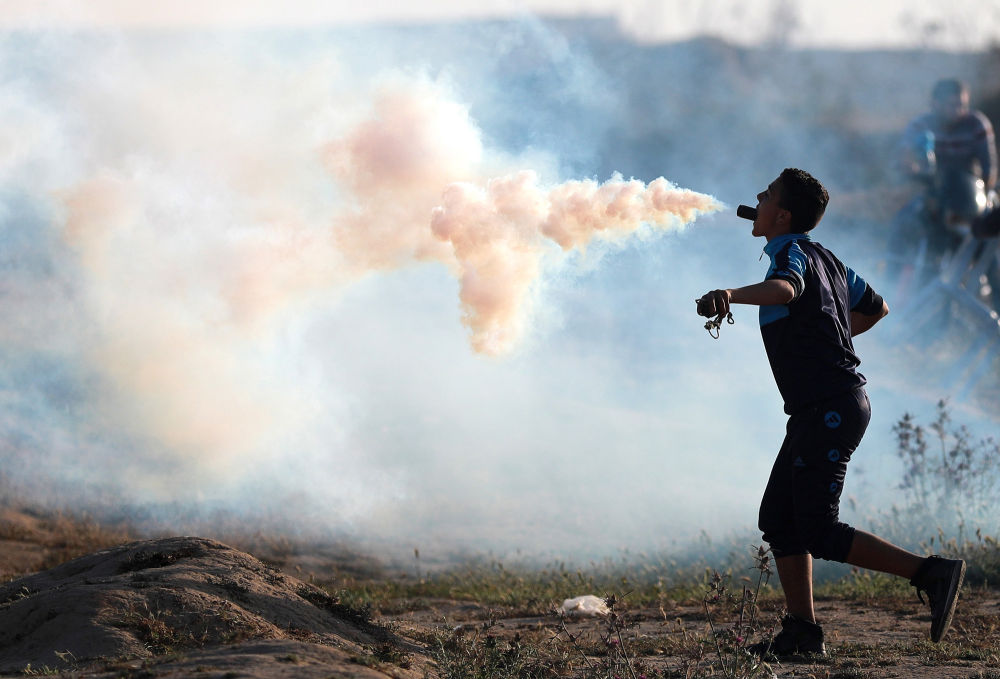 2019年4月12日,在加沙地带中部布赖杰难民营以东,一名巴勒斯坦示威者用嘴叼起以色列士兵发射的催泪弹。巴勒斯坦民众12日在加沙地带与以色列交界地区举行“回归大游行”示威活动,并与以军士兵发生冲突。新华社发(亚西尔摄)