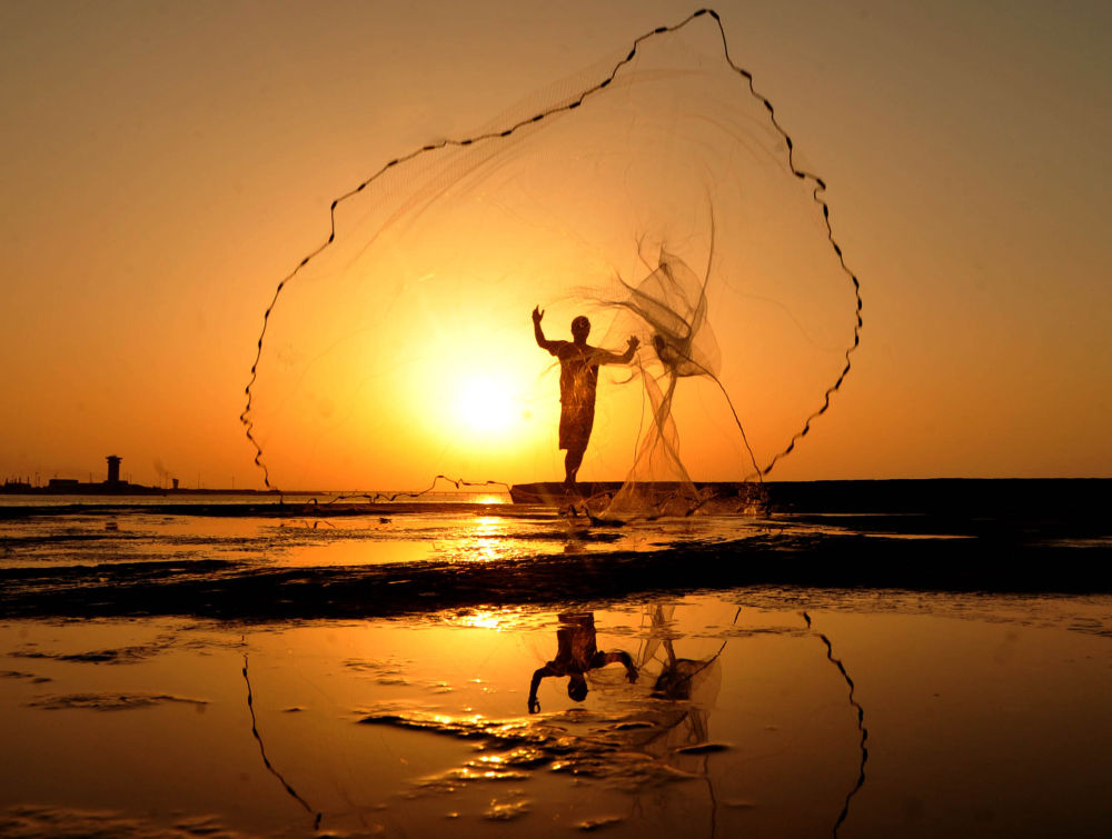 2019年7月7日,在科威特首都科威特城,渔民在落日余晖中撒下渔网。新华社发(阿萨德摄)