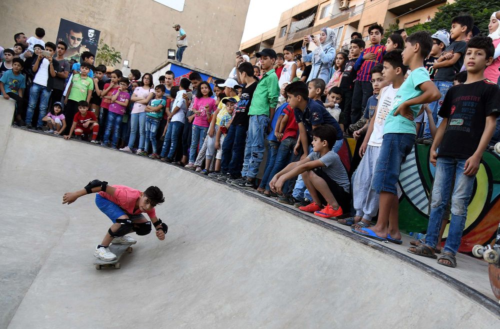 2019年7月15日,在叙利亚首都大马士革郊区一处新建的游乐设施,年轻人在玩滑板。新华社发(阿马尔摄)