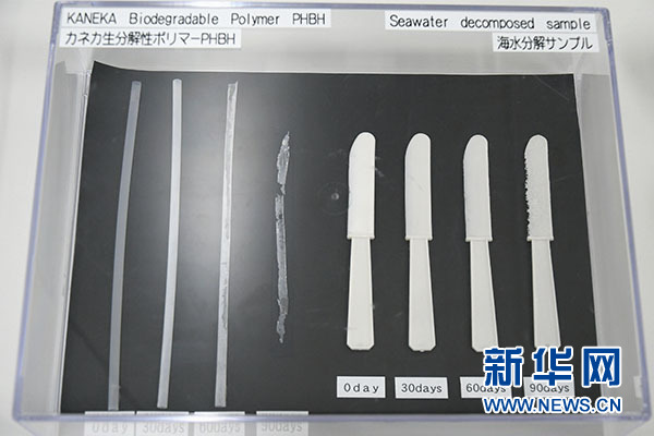 钟化公司是日本一家知名化学品公司,记者日前前往钟化公司的大阪总部,参观了该公司研发的可降解聚合物“PHBH”。据介绍,这种可自然降解聚合物“PHBH”百分之百来源于植物,通过培养摄取植物油的微生物进行生产提取,可用于制造各种塑料制品,“PHBH”在自然界中可被多种微生物分解。钟化公司还实物展示了“PHBH”塑料制品在海水中自然降解的不同阶段,例如一根吸管在海水中90天几乎可被自然降解殆尽。