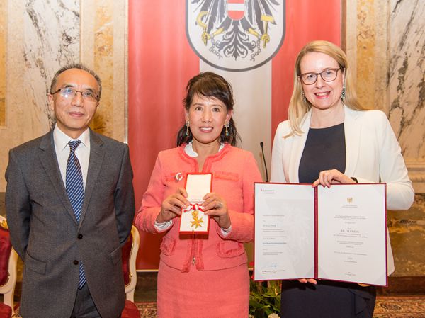 1月30日,杨丽博士(中)荣获奥地利共和国金质贡献勋章后与奥地利经济部长施拉姆伯克(右)和中国驻奥地利大使李晓驷(左)合影。