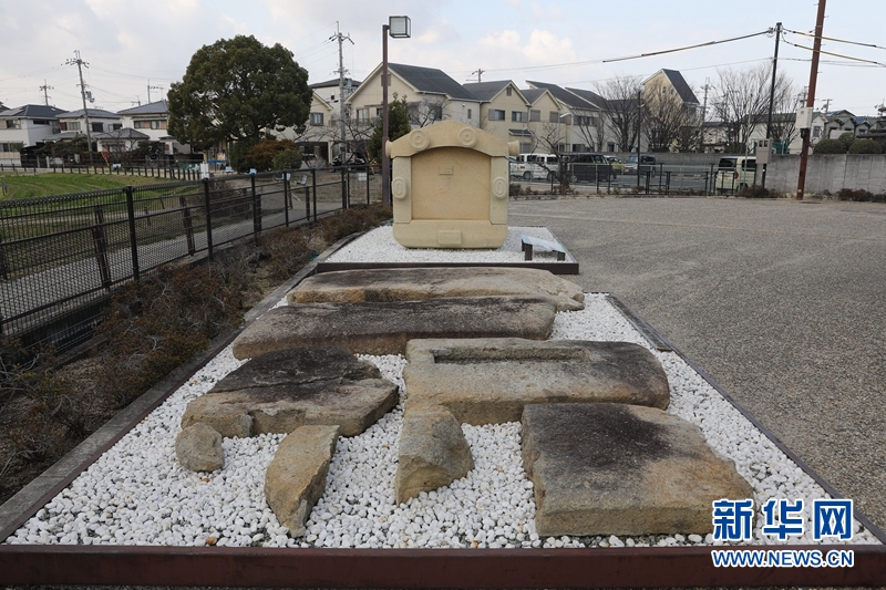 这是2月5日在日本大阪拍摄的从“百舌鸟和古市古坟群:古日本墓葬群”一处“古坟”内的石棺复制品(后)和当时压在石棺上的石板。记者 杜潇逸 摄