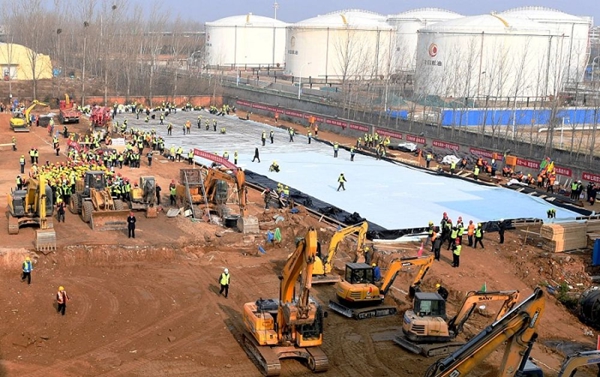 1月28日,在原郑州市第一人民医院港区医院基础上进行改造扩建的郑州版“小汤山”医院(郑州市新型冠状病毒隔离病房项目)正在加紧建设,预计2月5日完工交付。(郝源 摄)