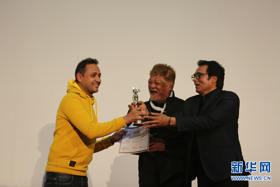 2月17日,第三届尼泊尔国际电影节的闭幕仪式在加德满都市政大厅内举行,资深电影人士正在给获奖者(左)颁奖。本届电影节2月13日开始,一共有来自40个国家和地区的80部影片入选,其中中国和哈萨克斯坦联合拍摄的《音乐家》作为开幕电影,备受关注。记者 唐薇 摄