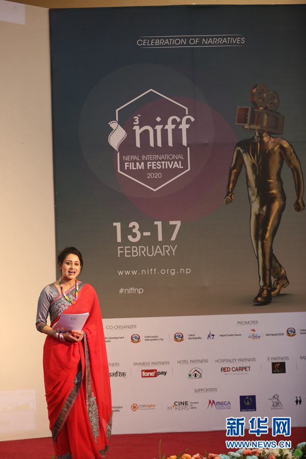2月17日,尼泊尔加德满都市政大厅,优雅美丽的主持人在第三届尼泊尔国际电影节在加德满都闭幕仪式上。本届电影节2月13日开始,一共有来自40个国家和地区的80部影片入选,其中中国和哈萨克斯坦联合拍摄的《音乐家》作为开幕电影,备受关注。记者 唐薇 摄