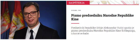 塞尔维亚总统武契奇(Aleksandar Vučić)致信习近平主席表示慰问,支持中国抗击疫情。塞尔维亚密切关注疫情发展,高度赞赏中国在面临险峻挑战时展现出的国家力量、透明高效和团结一致,坚信在习近平主席的坚强和英明领导下,中方一定能战胜疫情。