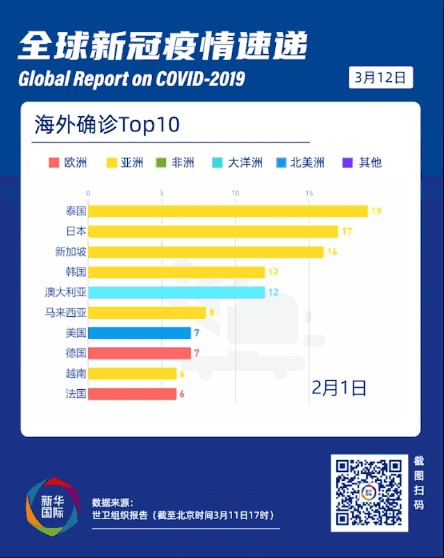 这是一组令人忧心的数字:过去两周,中国以外新冠肺炎确诊病例数增长了13倍,受影响国家和地区数增加了两倍。