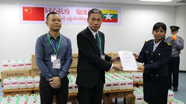 中国驻曼德勒总领事陈辰向机场捐赠防疫物资。