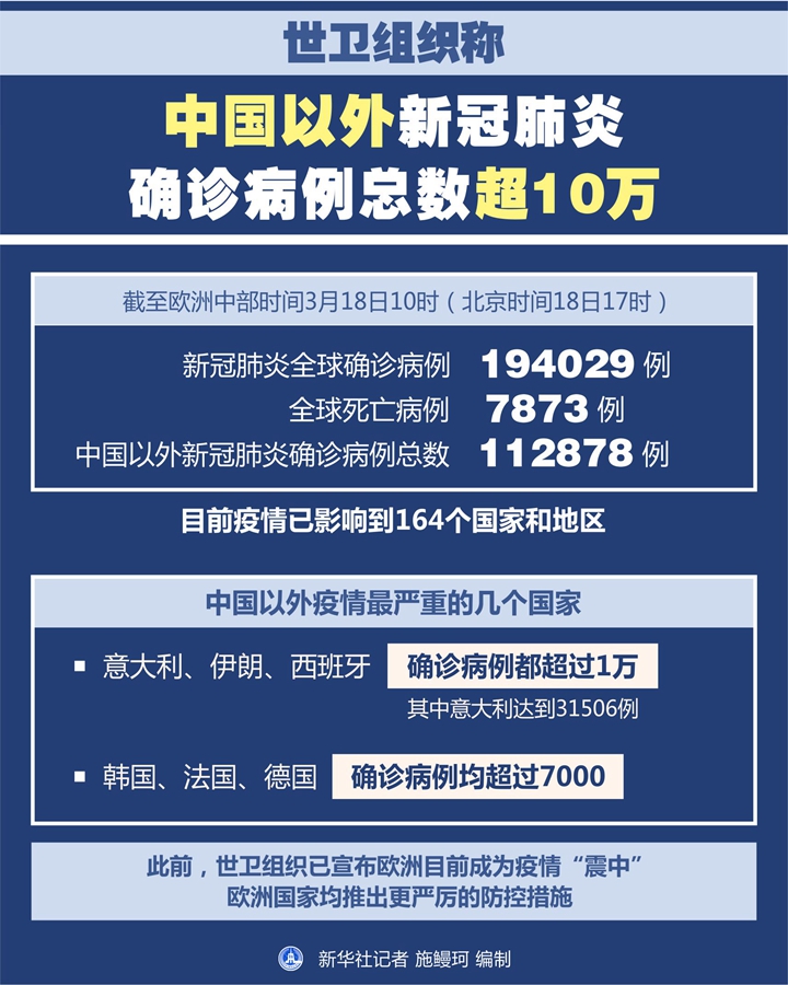 新华社日内瓦3月18日电(记者刘曲)世界卫生组织18日的最新数据显示,中国以外新冠肺炎确诊病例总数已超10万,达到112878例。