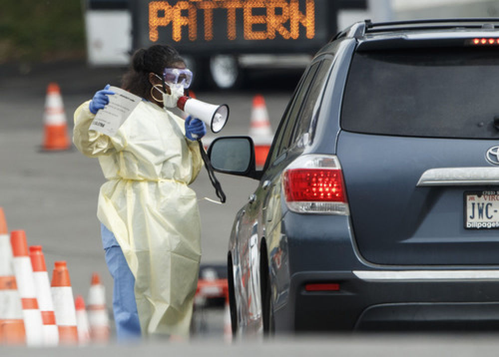 3月19日,在美国弗吉尼亚州阿灵顿,医护人员在一处“免下车”新冠肺炎检测点引导车辆。新华社发(沈霆摄)
