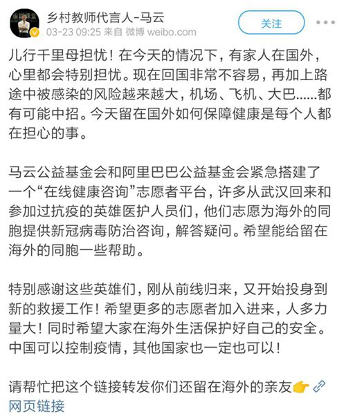 新华网北京3月23日电(李雪梅)23日,马云在其个人微博上宣布,马云公益基金会和阿里巴巴公益基金会紧急搭建了一个“在线健康咨询”志愿者平台。