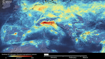 动图说明:欧洲航天局卫星日前监测到,疫情期间意大利二氧化氮等污染气体排放量明显下降(卫星:Sentinel-5P)。卫星携带的各类传感器能够采集空气中悬浮物颗粒的电磁波信号,从而对空气质量做出分析判断。图中的黄色代表二氧化氮等污染气体的浓度。