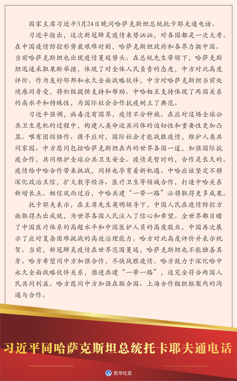 习近平强调,病毒没有国界,疫情不分种族。在应对这场全球公共卫生危机的过程中,构建人类命运共同体的迫切性和重要性更加凸显。唯有团结协作、携手应对,国际社会才能战胜疫情,维护人类共同家园。中方愿同包括哈萨克斯坦在内的世界各国一道,加强国际抗疫合作,共同维护全球公共卫生安全。疫情是暂时的,合作是长久的。疫情给中哈合作带来挑战,同样也孕育着新机遇。中哈应该坚定不移深化政治互信,扩大数字经济、医疗卫生等领域合作,打造中哈关系新增长点。相信风雨过后,中哈共建“一带一路”必将取得更多成果。