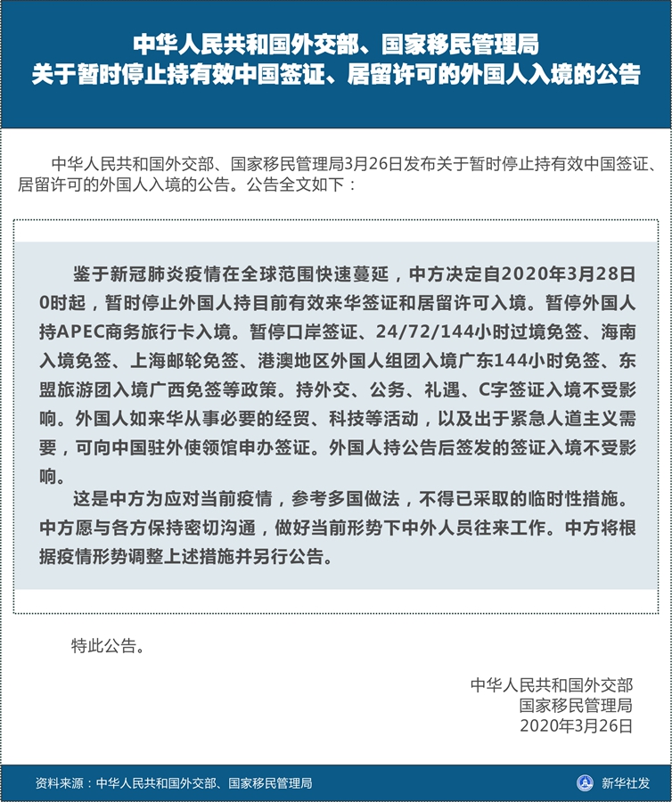 鉴于新冠肺炎疫情在全球范围快速蔓延,中方决定自2020年3月28日0时起,暂时停止外国人持目前有效来华签证和居留许可入境。暂停外国人持APEC商务旅行卡入境。暂停口岸签证、24/72/144小时过境免签、海南入境免签、上海邮轮免签、港澳地区外国人组团入境广东144小时免签、东盟旅游团入境广西免签等政策。持外交、公务、礼遇、C字签证入境不受影响。外国人如来华从事必要的经贸、科技等活动,以及出于紧急人道主义需要,可向中国驻外使领馆申办签证。外国人持公告后签发的签证入境不受影响。