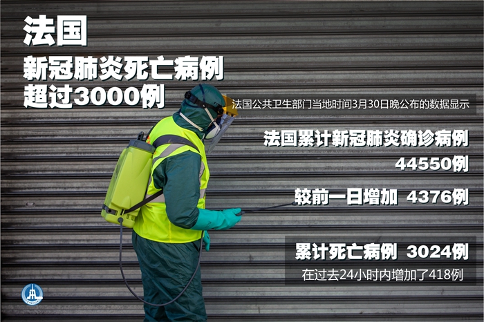 新华社巴黎3月30日电(记者陈晨)法国公共卫生部门30日晚公布的数据显示,法国累计新冠肺炎确诊病例44550例,较前一日增加4376例;累计死亡病例3024例,在过去24小时内增加了418例。