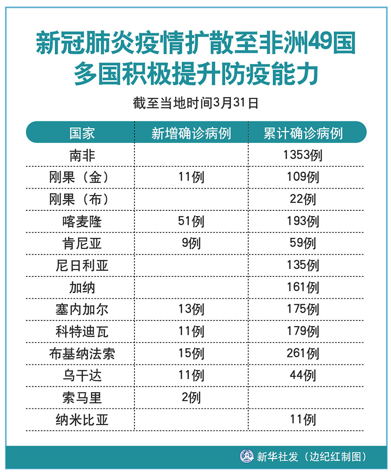 截至31日,刚果(金)新增确诊病例11例,累计109例;刚果(布)累计22例;喀麦隆新增51例,累计193例;肯尼亚新增9例,累计59例;尼日利亚累计135例;加纳累计161例;塞内加尔新增13例,累计175例;科特迪瓦新增11例,累计179例;布基纳法索新增15例,累计261例;乌干达新增11例,累计44例;索马里新增2例;纳米比亚累计11例。