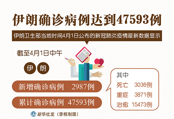 新华社德黑兰4月1日电(记者陈霖)伊朗卫生部4月1日公布的新冠肺炎疫情最新数据显示,截至当天中午,伊朗新增确诊病例2987例,累计确诊病例47593例,其中死亡3036例,重症3871例,治愈15473例。