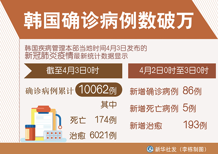 新华社首尔4月3日电(记者陆睿)韩国疾病管理本部3日发布的新冠肺炎疫情最新统计数据显示,截至3日0时,韩国确诊病例累计达10062例,其中死亡174例,治愈6021例。