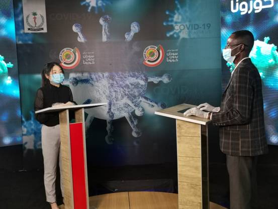 4月2日,中国第35批援苏丹医疗队队员郑喜在苏丹国家新冠肺炎防控中心演播厅接受采访并录制视频。(图片由医疗队提供)